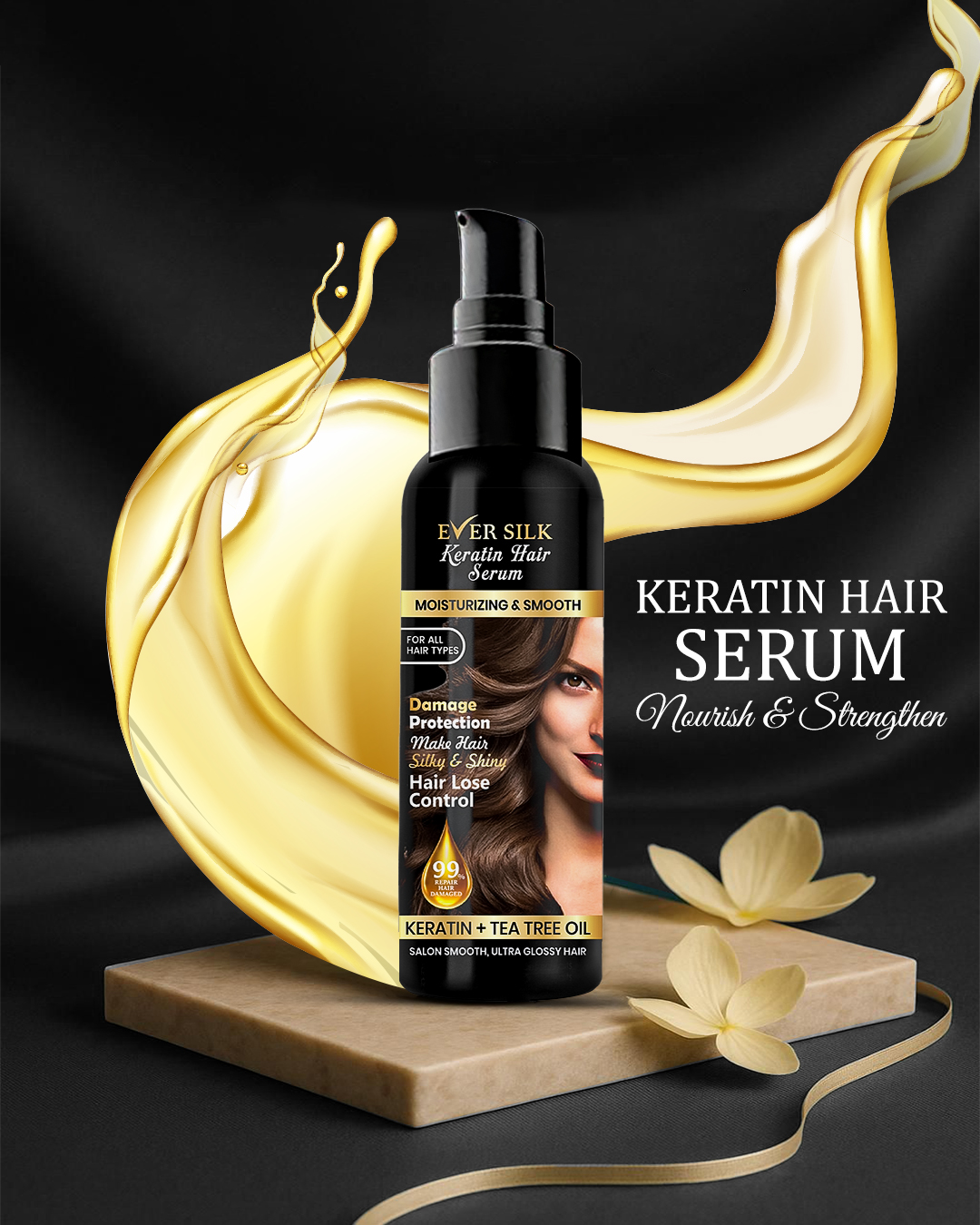Say goodbye to dull, lifeless hair and embrace the brilliance of Ever Silk Keratin Hair Serum. This isn’t just a serum; it’s a total hair revival system. By combining the structural power of Keratin with the purifying benefits of Tea Tree Oil, we’ve created a formula that repairs 99% of hair damage while providing an ultra-glossy, non-greasy finish.